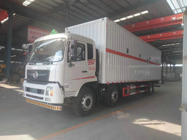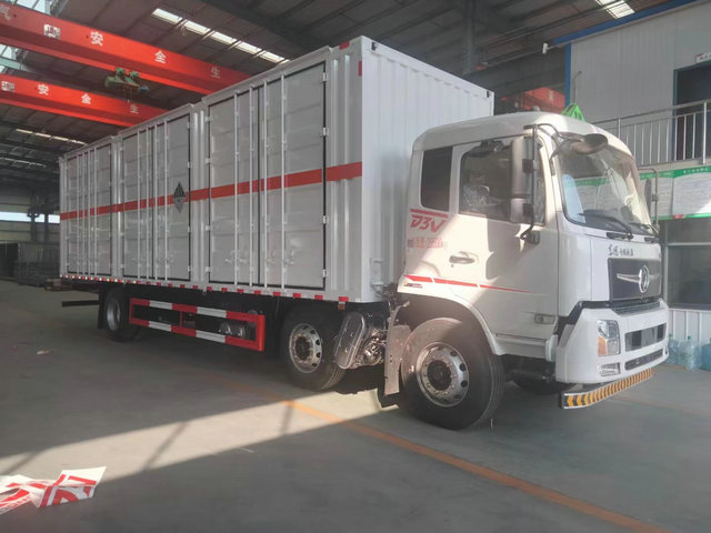 如圖大家可以看到,該車采用的是東風的車型,為前四后四的車身選擇,然后貨箱是這樣采用的一個密封式的狀態(tài),可以允許我們對于承載15噸左右的危廢進行運輸。