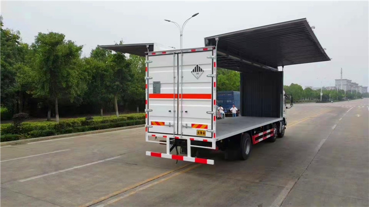 如圖大家可以看到該款車的兩側(cè)廂體為翼展結(jié)構(gòu),翼展開啟的時(shí)候我們進(jìn)行裝卸的工作就比較簡單了,這樣的話會(huì)不會(huì)對(duì)上戶有什么影響呢,是沒有的,我們做成這樣的貨箱結(jié)構(gòu)是目前新的上戶要求,也是完美的匹配了危險(xiǎn)品車的生產(chǎn)標(biāo)準(zhǔn),所以大家以后如果運(yùn)輸裝卸簡單輕松的話,選擇此款車型是非常合適的。
