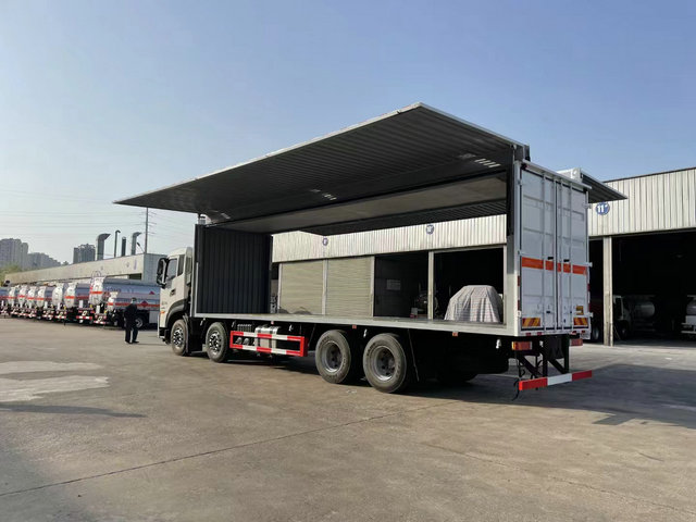 當然除了飛翼式貨箱的標準,我們還可以做成類似的全開門,這樣的話也是很方便與我們進行裝卸的,飛翼展開的話會有時候廠區(qū)的高度有所限制,無法達到一個很好的標準,這個時候就需要我們用到左右兩側全開門式的車廂,來應付對于裝卸的不同要求。