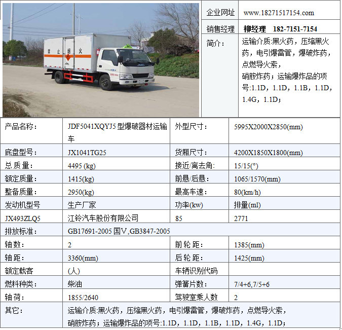 運輸簡介:該車為一類爆破器材運輸車:可運輸包括煙花爆竹,雷管炸藥,黑火藥,導火索以及各種易爆品物質。產品類項號:1.1,1.1A,1.2,1.3,1.4G等。