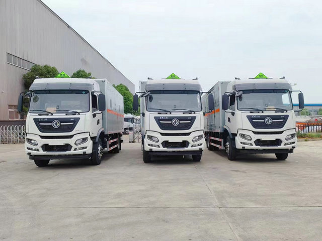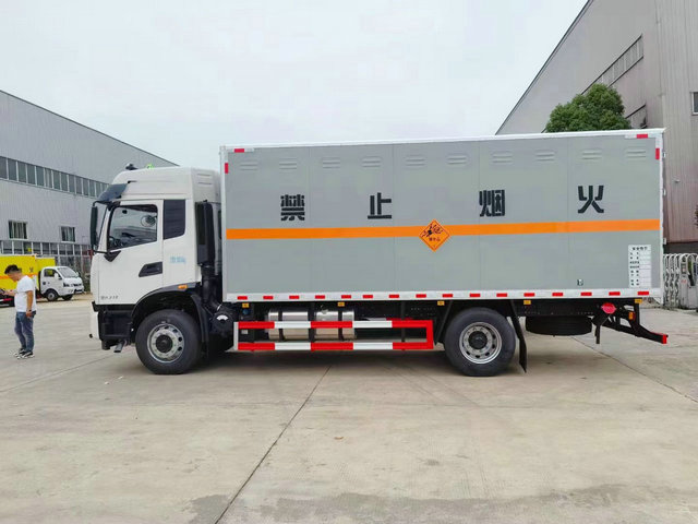 東風(fēng)天錦載重10噸爆破器材運輸車上裝配置:廂體長寬高:6200X2450X2400(MM),核載噸位:9.99噸,車輛外部采用專用冷軋鋼板,內(nèi)部采用鋁板,夾層復(fù)合阻燃材料,嚴格控制防火阻燃性,車廂內(nèi)以及邊部安裝的有煙霧報警器以及固定裝置,廂體貼‘爆破器材’危險品標(biāo)識。